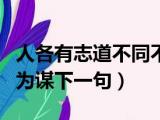 大家好,小活来为大家解答以上的问题。人各有志道不同不相为谋下一句,道不同不相为谋下一句这个很多人还不知道,现在让我们一起来看看吧!1 浏览全文>>