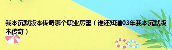 大家好,小活来为大家解答以上的问题。我本沉默版本传奇哪个职业厉害,谁还知道03年我本沉默版本传奇这个很多人还不知道,现在让我们一起来看看吧!